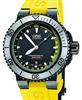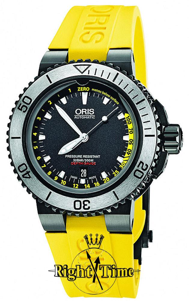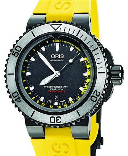 Oris Aquis Divers Depth Gauge 500m Water resistant model. Revolutionizing the world of professional diving Oris engineers relied on Boyle Mariotte Law in patenting this Oris Aquis Depth Gauge incorporated inside the extra thick watch crystal. Powered by Swiss Automatic SW200 movement, black DLC plated stainless steel case with silver color uni-directional 0-60 rotating bezel, screw-down crown, black dial with luminous hands and markers, date calendar, sapphire anti-reflective scratch-resistant crystal, yellow rubber watch strap and an extra black rubber strap with tools and waterproof case.