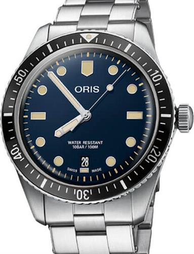 Oris Diver Sixty-Five model 0173377074055-0782018. Solid stainless steel case. Deep blue dial with large luminous markers. Powered by an automatic movement based on the SW200 with 26 jewels. Black uni-directional bezel with 60 minute markers. Comes on stainless steel bracelet.