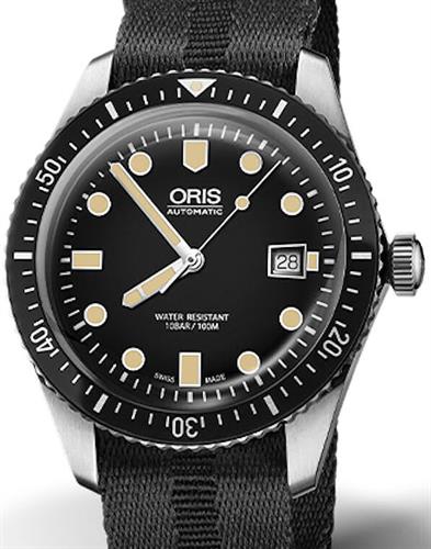 Oris Divers Sixty-Five model 01 733 7720 4054-07 5 21 26FC. Solid stainless steel case with dual satin/polish finish. Black dial with large Superluminova markers. Sapphire crystal. Powered by an automatic movement based on the SW200 with 26 jewels. Black uni-directional bezel with 60 minute markers. Comes on black NATO textile strap.