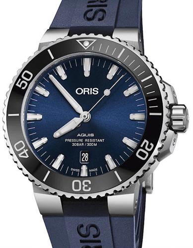 Oris Aquis Divers wrist watch. 300m Water resistant. Swiss Automatic movement, 43.5mm stainless steel case with black ceramic uni-directional 0-60 rotating bezel, screw-down crown, blue dial with luminous hands and markers, date calendar, sapphire anti-reflective scratch-proof crystal, blue rubber strap.