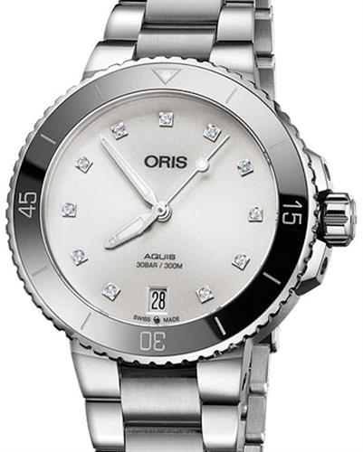 Oris Aquis Date wrist watch. 300m Water resistant. Swiss Automatic movement, 36.5mm stainless steel case with polished uni-directional 0-60 rotating bezel, screw-down crown, white dial with diamond markers, date calendar, sapphire anti-reflective scratch-proof crystal, stainless steel bracelet.