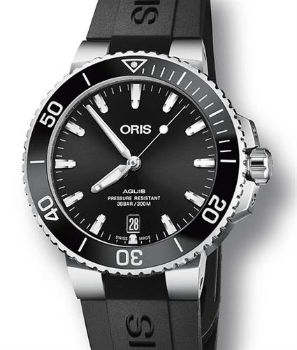 Oris Aquis Divers wrist watch. 300m Water resistant. Swiss Automatic movement, 39.5mm stainless steel case with black ceramic uni-directional 0-60 rotating bezel, screw-down crown, black polished dial with luminous hands and markers, date calendar, sapphire anti-reflective scratch-proof crystal, black rubber band.