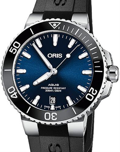 Oris Aquis Divers wrist watch. 300m Water resistant. Swiss Automatic movement, 39.5mm stainless steel case with black ceramic uni-directional 0-60 rotating bezel, screw-down crown, blue polished dial with luminous hands and markers, date calendar, sapphire anti-reflective scratch-proof crystal, black rubber strap.