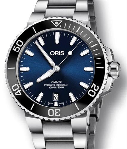 Oris Aquis Divers wrist watch. 300m Water resistant. Swiss Automatic movement, 39.5mm stainless steel case with black ceramic uni-directional 0-60 rotating bezel, screw-down crown, blue polished dial with luminous hands and markers, date calendar, sapphire anti-reflective scratch-proof crystal, stainless steel bracelet.