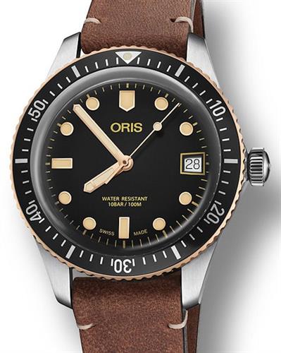 Oris Sixty-Five Diver model 01 733 7747 4354-07 5 17 45. Solid stainless steel 36mm case with black bronze bezel. Black dial. Sapphire crystal. Powered by an automatic movement based on the SW200 with 26 jewels. Comes on a brown leather band.