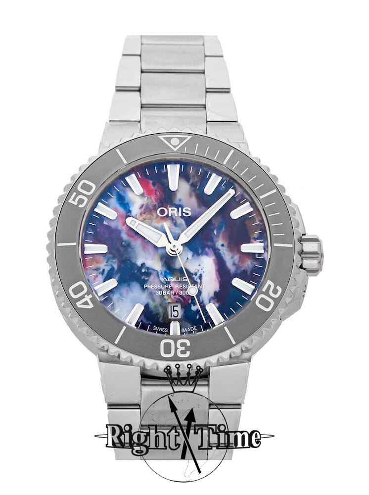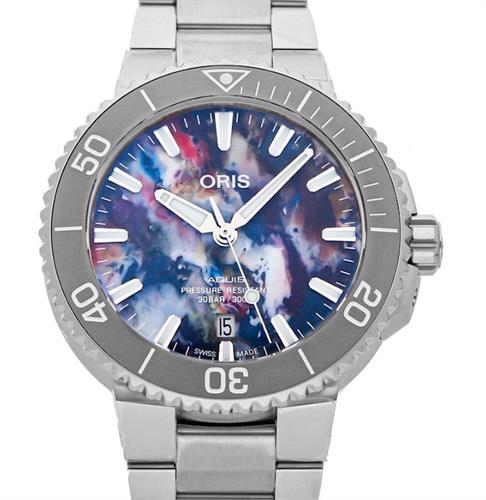 Oris Aquis Upcycle Diver model 01 733 7766 4150-SET. Each watch dial is unique. It is made using the PET plastic recycling process. Watch also features Swiss made Oris caliber 733 automatic movement. Stainless steel case and bracelet. Steel uni-directional bezel with 0-60 scale. Luminous hands and markers. Sapphire crystal. Water resistant to 300 meters.
