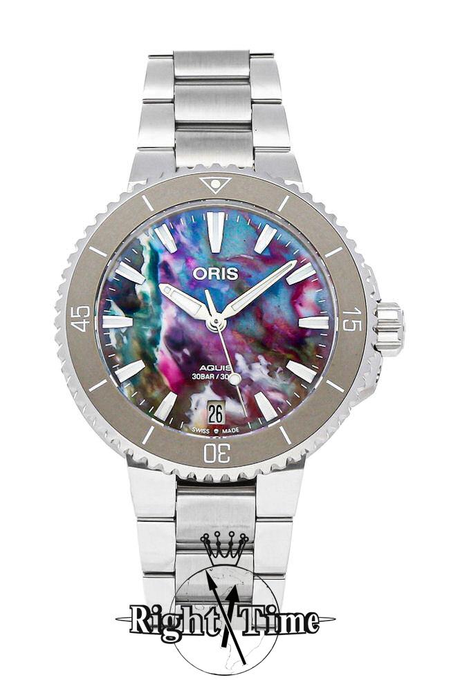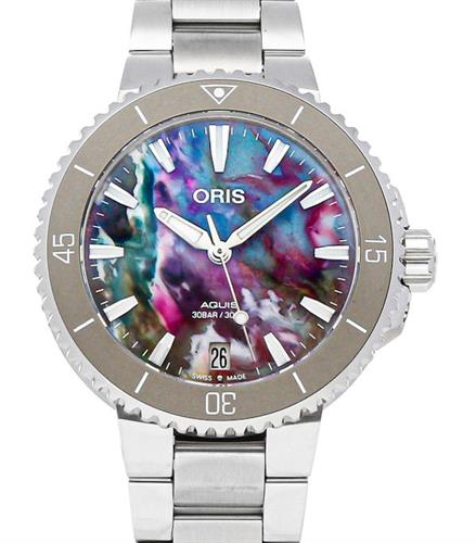 Oris Aquis Upcycle Diver model 01 733 7770 4150-Set. Each watch dial is unique. It is made using the PET plastic recycling process. Watch also features Swiss made Oris caliber 733 automatic movement. Stainless steel case and bracelet. Steel uni-directional bezel with 0-60 scale. Luminous hands and markers. Sapphire crystal. Water resistant to 300 meters.