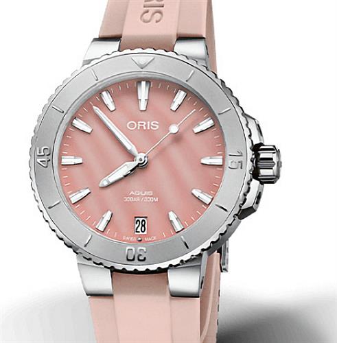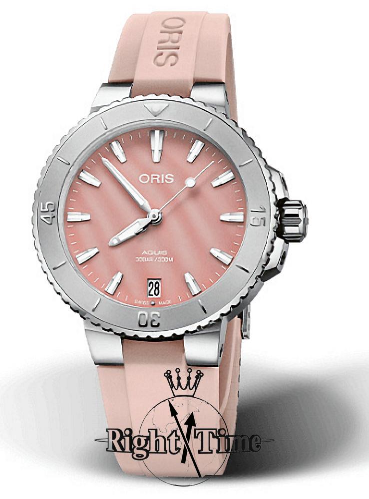 Oris Aquis Date model 01 733 7770 4158-07 4 18 66FC. Stainless steel case with pink rubber band. Blush pink genuine mother-of-pearl dial with luminous hands and markers. Swiss made Oris Caliber 733 automatic movement. Domed sapphire crystal with anti-glare coating. Diver rated to 300 meters. Stainless steel uni-directional diver bezel with 60 minute scale.