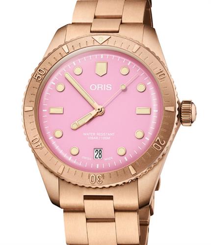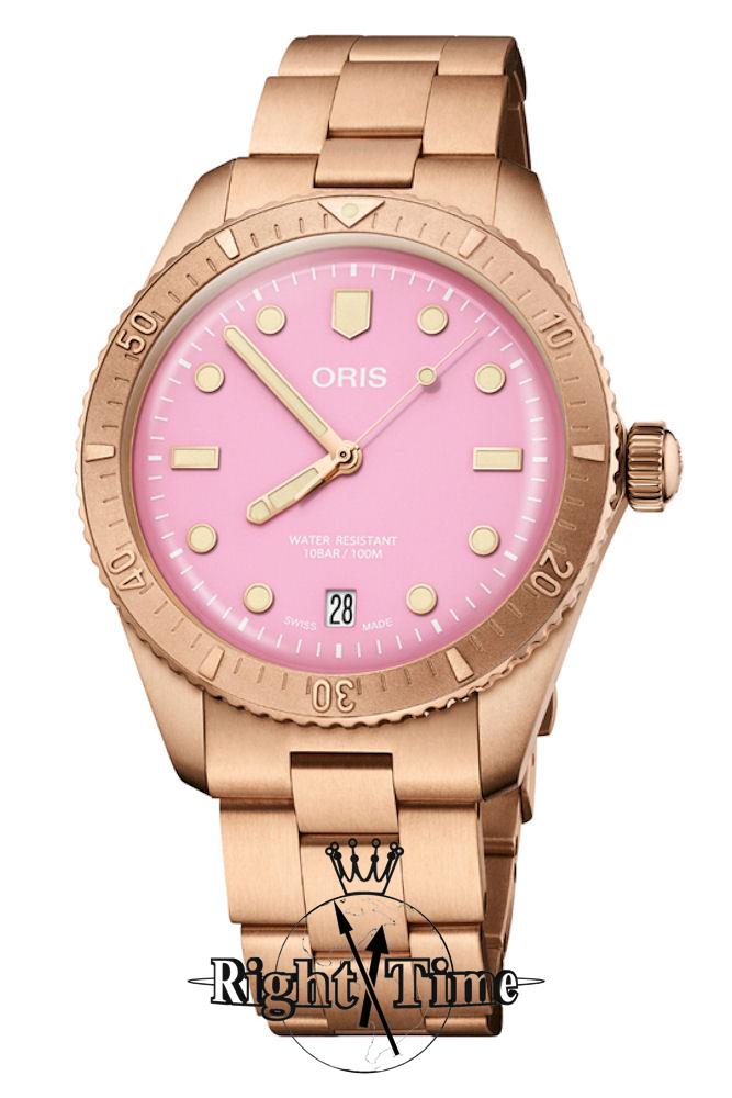 Oris Divers Sixty-Five Cotton Candy model 01-733-7771-3158-07 8 19 15. Solid bronze 38mm case. Red dial. Sapphire crystal. Powered by an automatic movement based on the SW200 with 26 jewels. Comes with a bracelet.