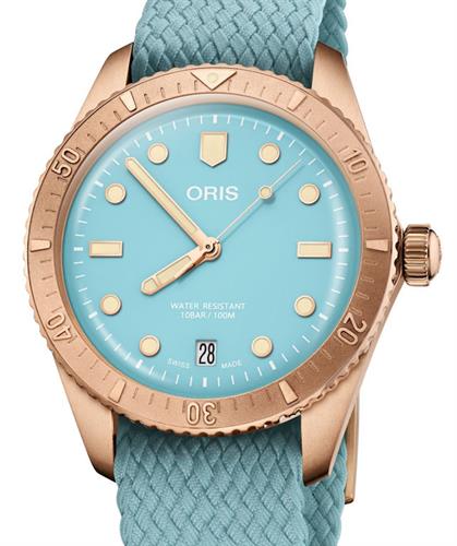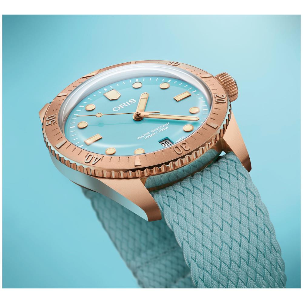 Oris Divers Sixty-Five model 01 733 7771 3155-07 3 19 02BRS. Solid bronze 38mm case. Sky blue dial. Sapphire crystal. Powered by an automatic movement based on the SW200 with 26 jewels. Comes on blue textile strap