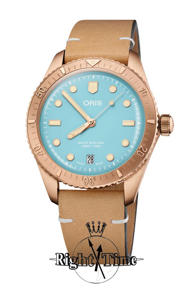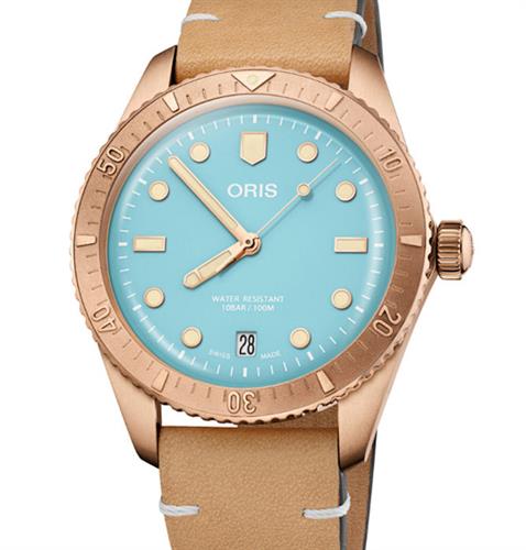 Oris Divers Sixty-Five Cotton Candy model 01-733-7771-3155-07 5 19 04BR. Solid bronze 38mm case. Blue dial. Sapphire crystal. Powered by an automatic movement based on the SW200 with 26 jewels. Comes on brown leather strap