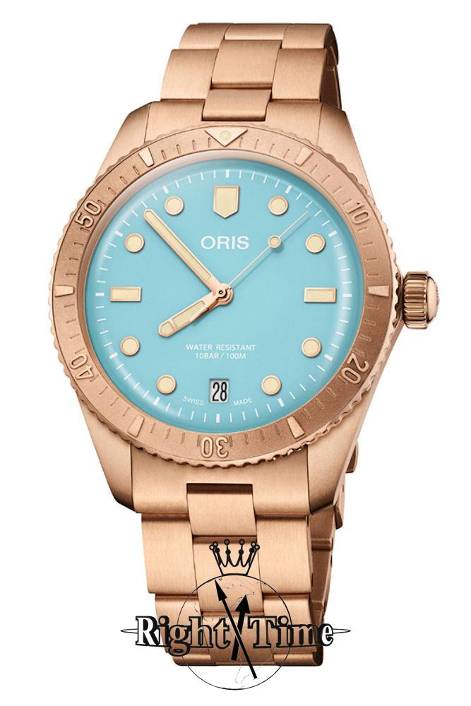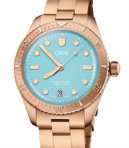 Oris Divers Sixty-Five Cotton Candy model 01-733-7771-3155-07 8 19 15. Solid bronze 38mm case. Blue dial. Sapphire crystal. Powered by an automatic movement based on the SW200 with 26 jewels. Comes with a bracelet.