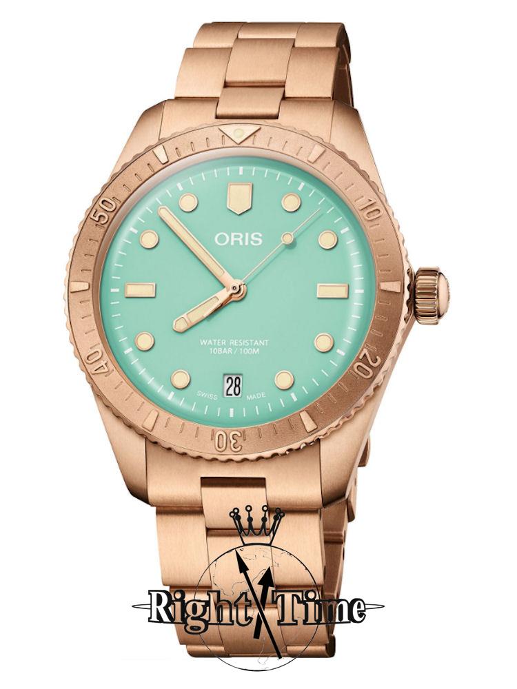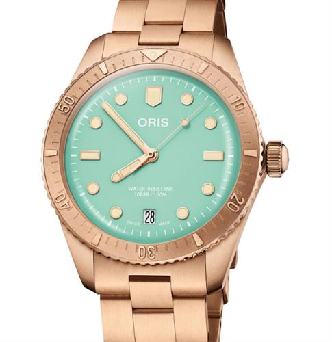 Oris Divers Sixty-Five Cotton Candy model 01-733-7771-3157-07 8 19 15. Solid bronze 38mm case. Green dial. Sapphire crystal. Powered by an automatic movement based on the SW200 with 26 jewels. Comes with a bracelet.