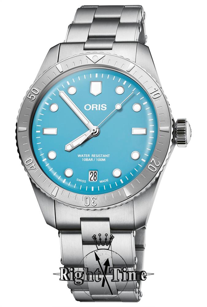 Oris Diver Sixty-Five Cotton Candy model 01 733 7771 4055. Solid stainless steel case and bracelet. Sky blue dial with luminous hands and markers. Swiss made Oris Caliber 733 automatic movement. Stainless steel uni-directional bezel with 60 minute markers. Domed sapphire crystal with anti-glare treatment. Water resistant to 100 meters.