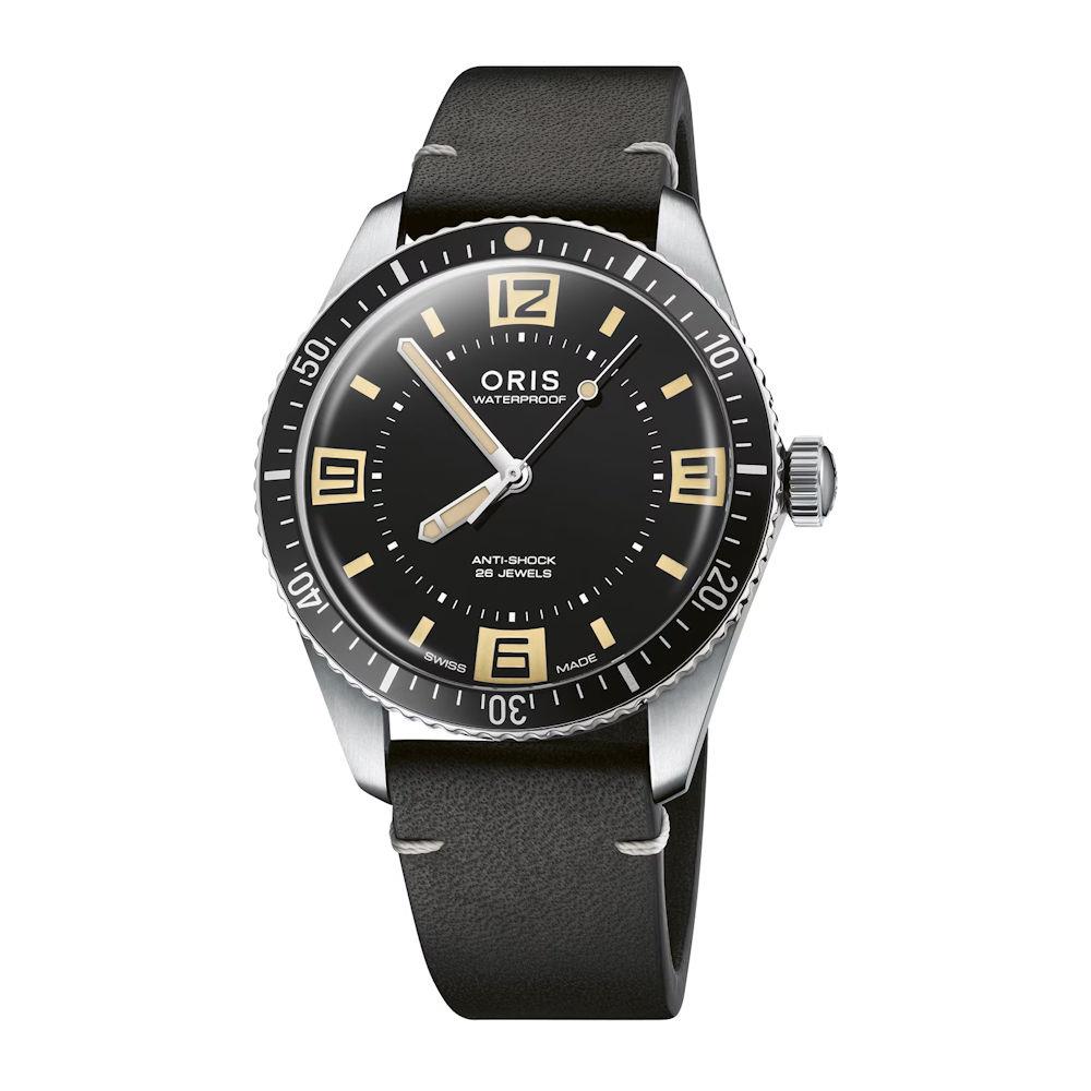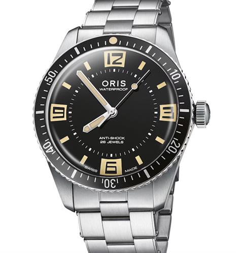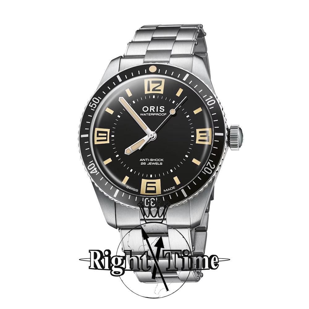 Oris Diver 60th Anniversary Edition model 01 733 7772 4034-SET. Solid stainless steel case and bracelet. Black dial with luminous hands and markers. Swiss made Oris Caliber 733 automatic movement. Stainless steel uni-directional bezel with 60 minute markers. Domed sapphire crystal with anti-glare treatment. Water resistant to 100 meters. Comes with an additional leather band