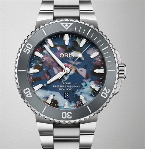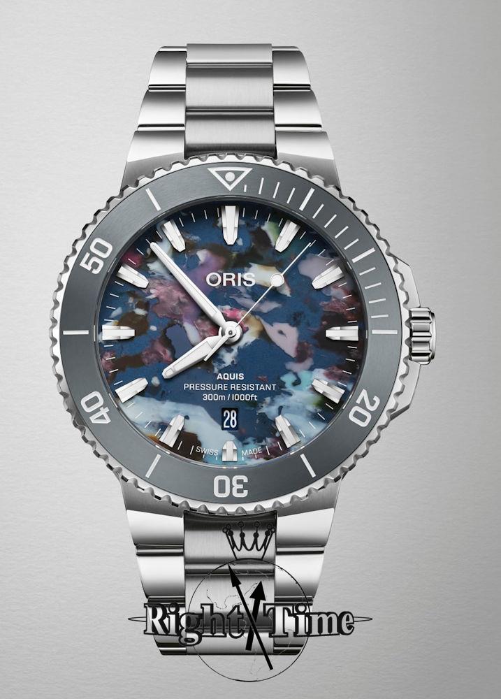 Oris Aquis Date Upcycle model 01 733 7789 4150-07 8 23 04PEB. Stainless steel case and bracelet. Multi-colored dial with luminous hands and markers. Swiss made Oris Caliber 733 automatic movement. Domed sapphire crystal with anti-glare coating. Diver rated to 300 meters. Stainless steel uni-directional diver bezel with 60 minute scale.