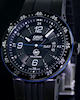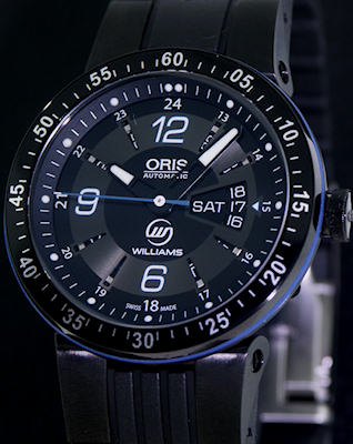 Oris Williams F-1 Team automatic watch. Black dial with see-through markers and day/3-date calendar. Black PVD steel case with blue accents, 0-60 numbers on the black bezel and observation case back. Black rubber watch strap.