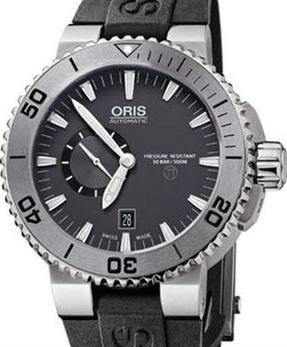 Oris Aquis Titan Small Second Divers wrist watch. 500m Water resistant. Swiss Automatic movement,titanium case with tungsten uni-directional 0-60 rotating bezel, screw-down crown, grey dial with luminous hands and markers, date calendar, small seconds sub-dial, sapphire anti-reflective scratch-proof crystal, rubber watch band.