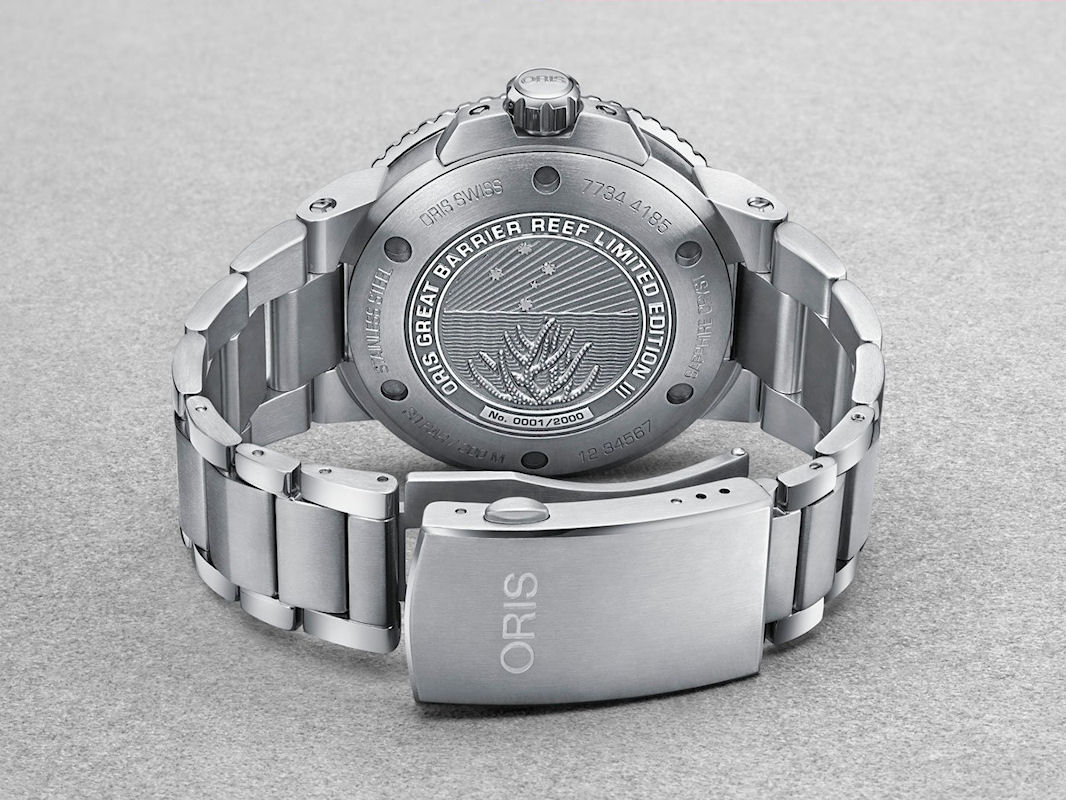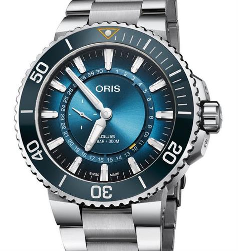 Oris Aquis Great Barrier Reef Limited Edition III, model 01 743 7734 4185-set. Created in partnership with the Reef Restoration Foundation. Multi-piece solid stainless steel case and bracelet. Uni-directional ceramic blue bezel with 0-60 minute scale. Blue dial with small second display at 9 o`clock. Dial and bezel feature a blue color gradient recalling the colors of the reef waters. Powered by the Oris 743, base SW 220-1 movement. Rated to 300 meters water resistant. Sapphire scratch-resistant crystal. Limited Edition of 2000 pieces