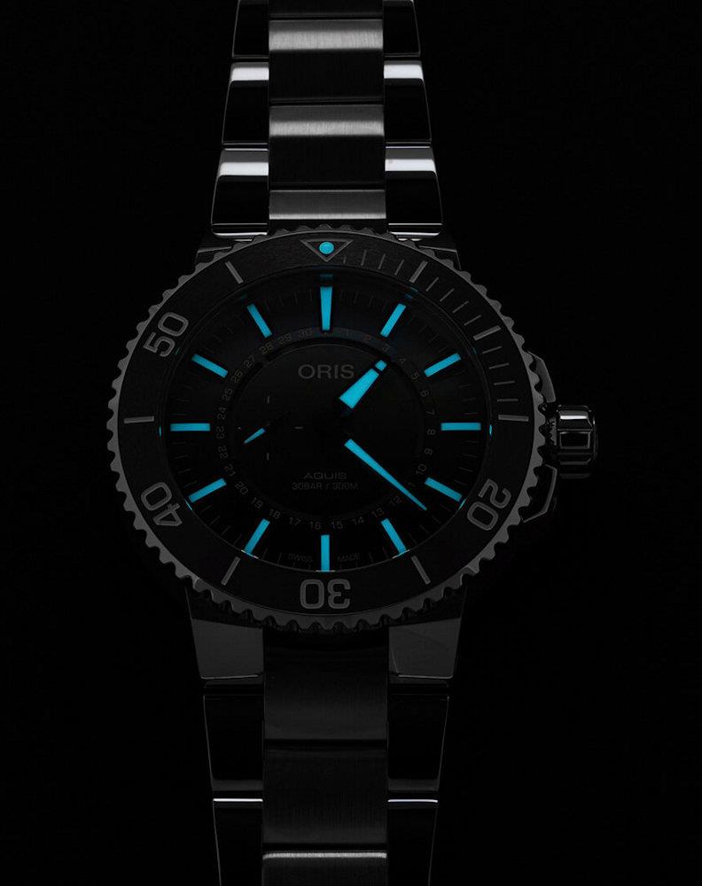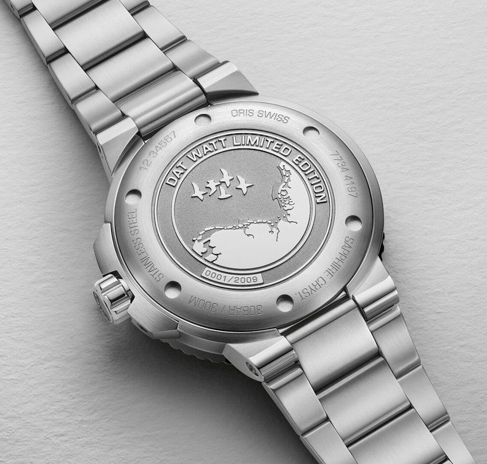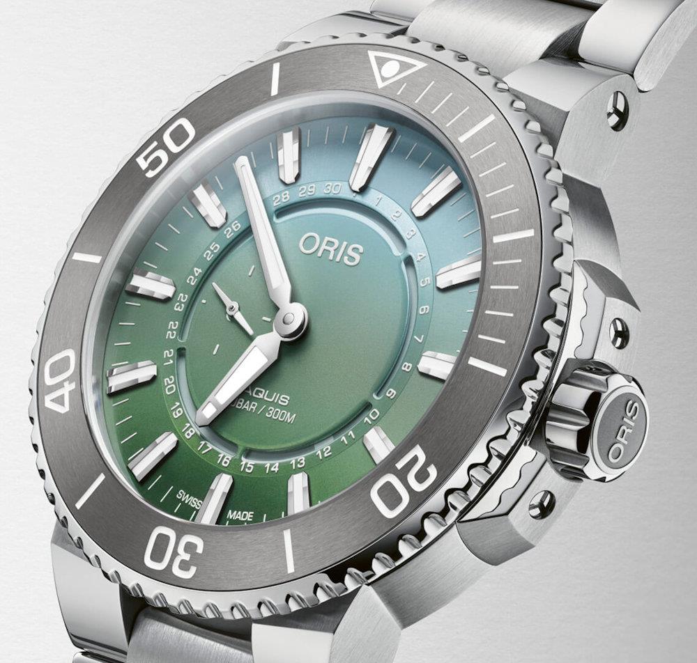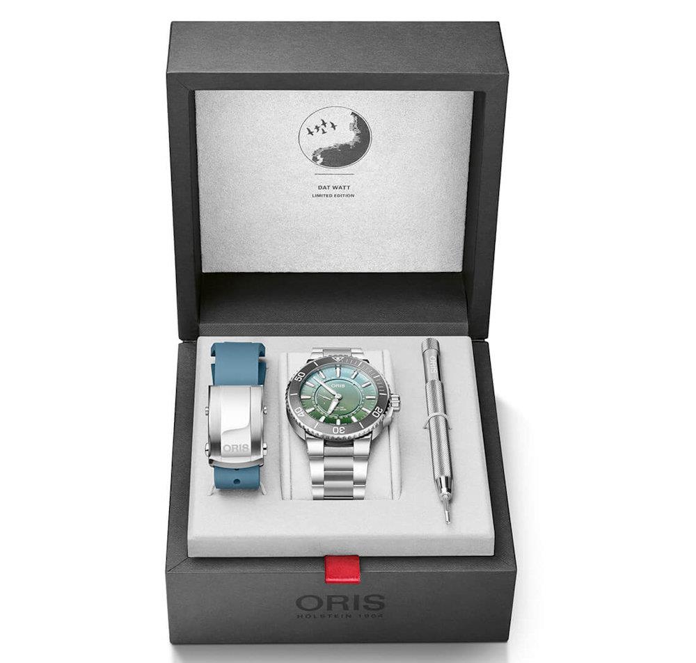 Oris Dat Watt Limited Edition II. 300m Water resistant. Swiss Automatic movement, Stainless Aquis case with uni-directional 0-60 rotating bezel, screw-down crown, green dial with luminous hands and markers, date pointer, small seconds sub-dial, sapphire anti-reflective scratch-proof crystal, steel bracelet.