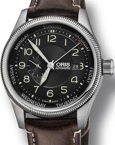 Oris Big Crown Small Second, Pointer Day. Swiss automatic movement, stainless steel case with brown leather band, black color dial with date calendar and day pointer hand, sapphire crystal