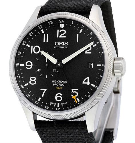 Oris Big Crown Pro Pilot. Factory model number 01 748 7710 4164-07 5 22 15FC. Stainless steel case with black textile strap. Sapphire crystal. Black dial with yellow accent on date hand. Swiss automatic movement with GMT hand. Water resistant to 100 meters.