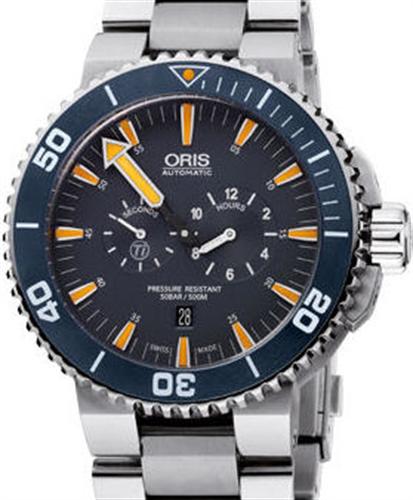 Oris Aquis Tubbataha Limited Edition to honour the great work of the Tubbataha Reef Project. 500m Water resistant. Swiss Automatic movement with regulator technique, titanium case with blue ceramic uni-directional 0-60 rotating bezel, screw-down crown, blue dial with orange luminous hands and markers, date calendar, sapphire anti-reflective scratch-proof crystal, titanium watch bracelet.