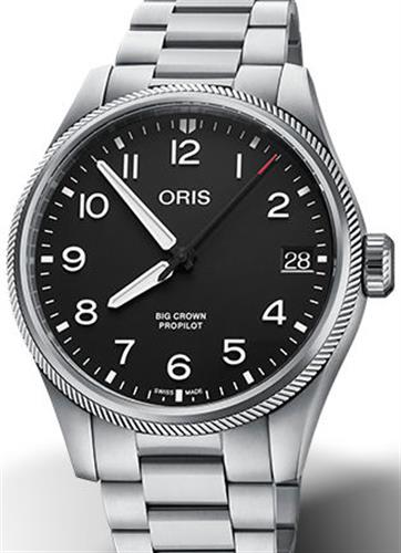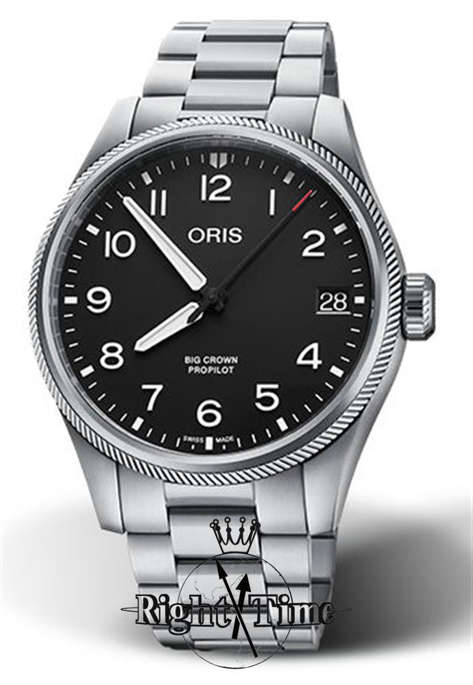 Oris Big Crown series ProPilot. Swiss made Oris 751, base SW 220-1 automatic movement. Satin finished stainless steel case and bracelet. Black dial with extra large date display window. Sapphire crystal treated with anti-glare.