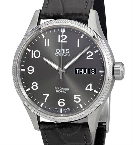 Oris model 01 752 7698 4063. Big Crown series ProPilot day/date with new polished grey dial. Oris 752, base SW 220-1 Swiss automatic movement. Satin finished solid stainless steel case with grey leather band. Scratch resistant sapphire crystal.