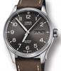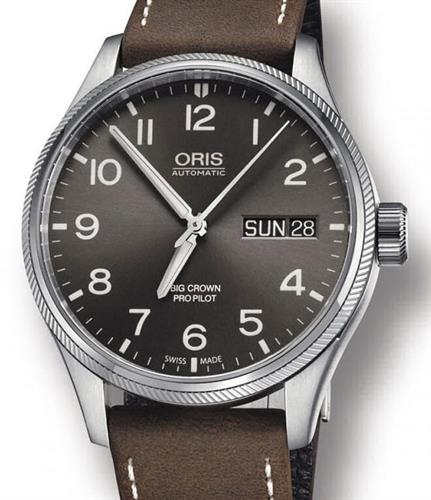Oris model 01 752 7698 4063. Big Crown series ProPilot day/date with new polished grey dial. Oris 752, base SW 220-1 Swiss automatic movement. Satin finished solid stainless steel case with brown leather band. Scratch resistant sapphire crystal.