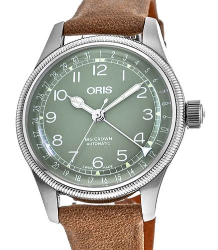Oris Big Crown Pointer Date. Model 01 754 7749 4067-07 5 17 68. Stainless steel case with brown leather band. Green dial with Arabic numerals. Swiss automatic movement.