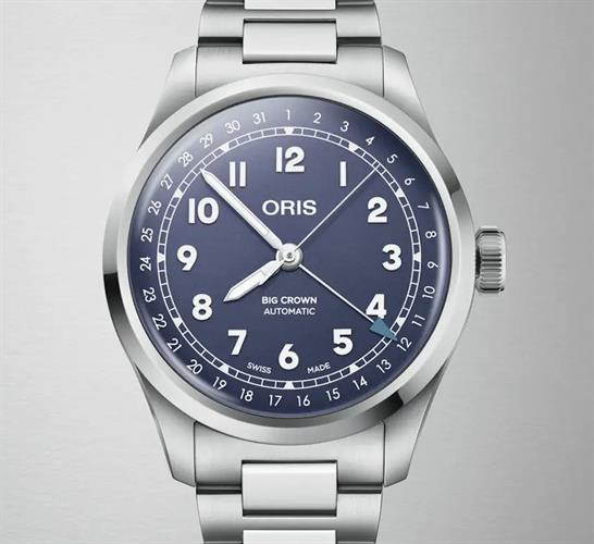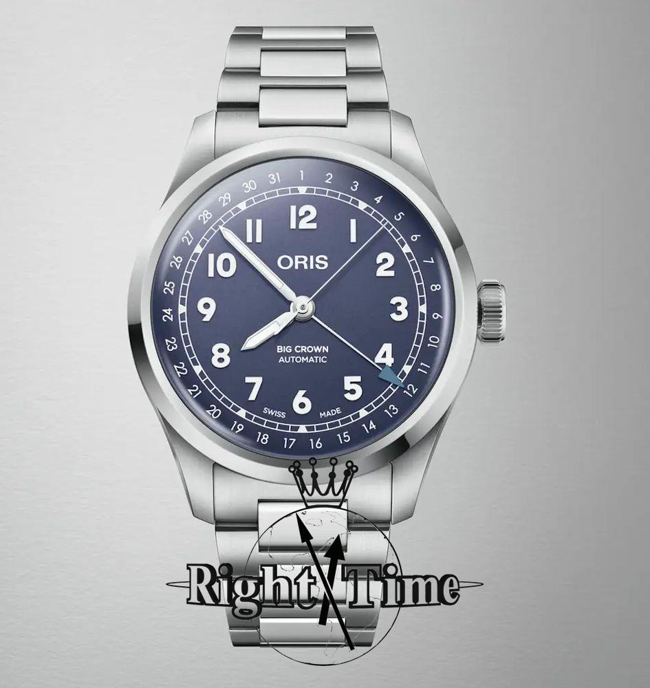 Oris Big Crown Pointer Date. Model 01 754 7798 4068-07 8 20 06. Solid 40mm stainless steel case with bracelet. Purple dial Arabic numerals. Oversized big crown style. Domed sapphire crystal. Swiss automatic movement.