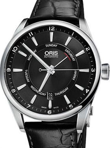 Oris Artix Pointer Day, Date. Swiss automatic movement, stainless steel case with black leather band, black color dial with date and day pointer hand, sapphire crystal