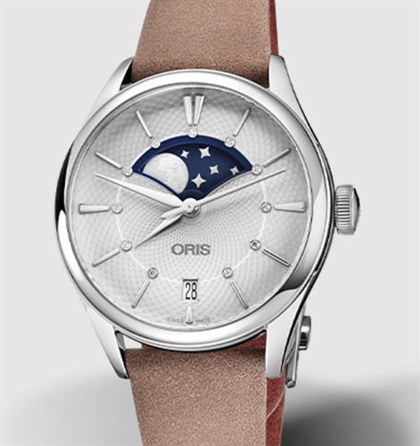 Oris Artelier Grande Lune model 01 763 7723 4051-07 5 18 33FC. Stainless steel Artelier case. SW220-1 based Auto-wind movement. Silver color textured dial with date, and moon phase calendar. Sapphire crystal. Tan leather band.