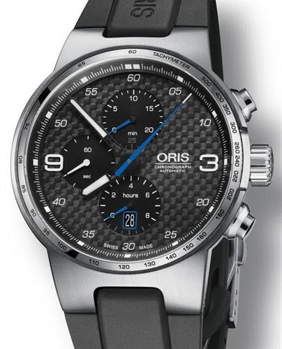 Oris Williams Chronograph model 01 774 7717 4164-07 4 24 50FC . Steel 44mm case with black carbon fiber dial and rubber band. Swiss automatic chronograph SW 500 movement with date.