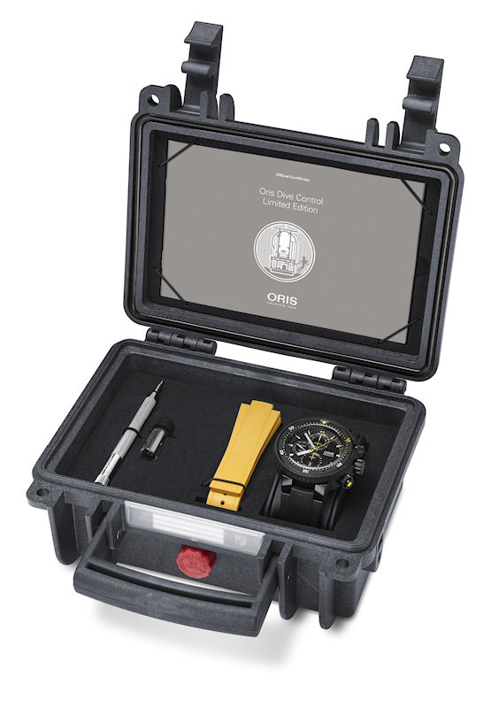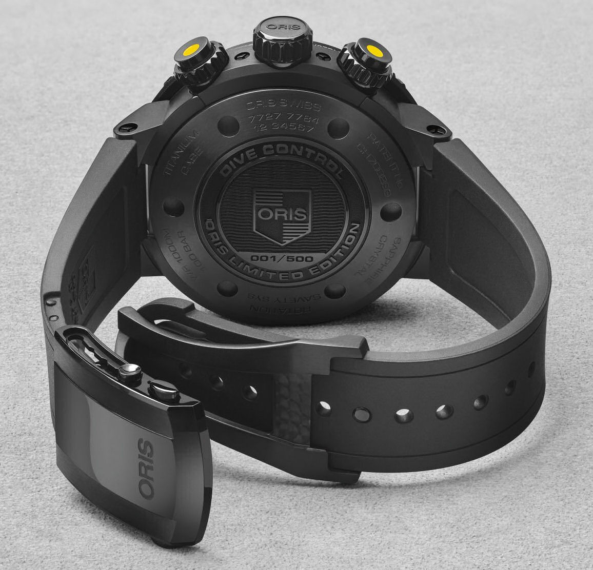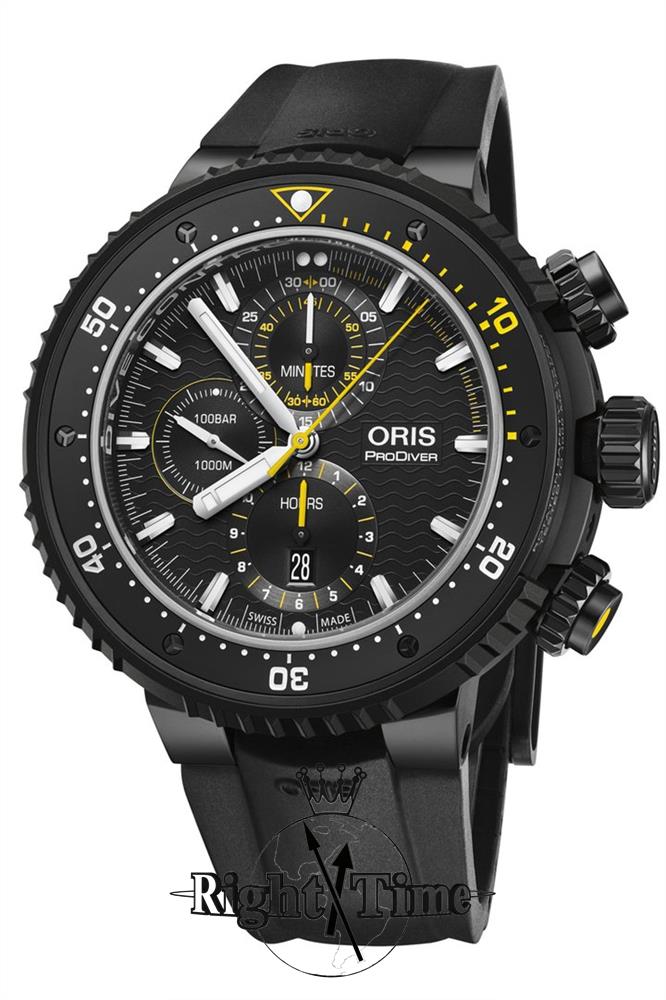 Oris ProDiver Dive Control Limited Edition Chronograph. Swiss made Oris 774 (base SW 500) 25 jewel automatic movement. DLC black titanium case with rubber strap. Black dial with yellow color accents and printed wave texture. Uni-directional black ceramic bezel with 60 minute scale. 1000 meters water resistant. Sapphire crystal.