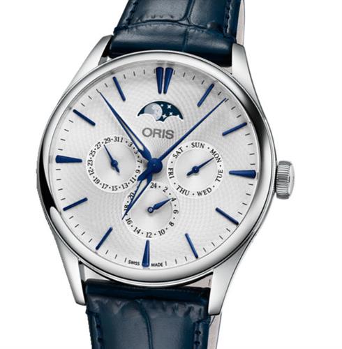 Oris Artelier Complication with Day, Date, moon-phase, and 24-hour indicators model 01 781 7729 4051-07 5 21 66FC. Highly polished stainless steel case. Beautiful textured silver dial with blue markers and hands under a domed sapphire crystal. Oris 781, base SW 200-1 automatic movement with observation back. Blue leather band.