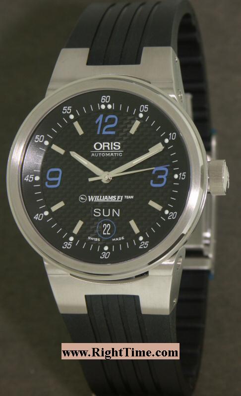 Oris Williams F1 Team wrist watch from Oris Williams F1 Collection. Swiss ETA Automatic 2836 movement, polished and satin finished stainless steel case, combination of index markers and blue Arabic numerals on black textured dial with day/date calendar, skeleton case back, black rubber watch strap with tri-fold clasp.