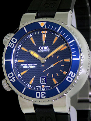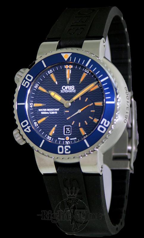 Oris GREAT BARRIER REEF Limited Edition divers wrist watch with helium valve from Oris Limited Edition Collection. Limited Edition of 1000 pieces. 1000m Water resistant. Swiss ETA Automatic movement modified by Oris with small second hand and date, steel 47mm case with uni-directional 0-60 rotating bezel, screw-down crown, luminous hands and markers on black dial with date calendar, sapphire anti-reflective scratch-proof crystal, rubber watch band. Comes with a set: metal watch bracelet and tools.
