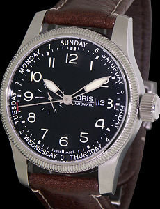 Oris Big Crown automatic watch based on ETA 2836-2 movement with date calendar, small seconds platform and day hand pointer. Black dial with Arabic luminous numbers. Stainless steel case, brown leather strap, observation case back.