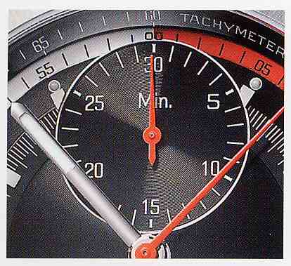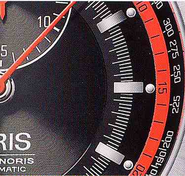 Black color. Luminous ( radiation-free Super-LumiNova ) hour markers. The dial is presented in the cockpit style. Orange is used to highlight the big center second, stop ring, and the decentralized small minute at 12 o'clock. The outer tachometer ring rounds off the sport-inspired design.