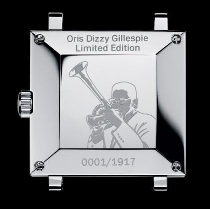Oris Dizzy Gillespie Limited Edition watch. This watch is dedicated to the co-founder of bebop and modern jazz. Square case stainless steel case, automatic movement, smooth black leather strap. Dizzy Gillespie`s portrait engraved on the case back. Limited to 1917 watches to mark the year of his birth.