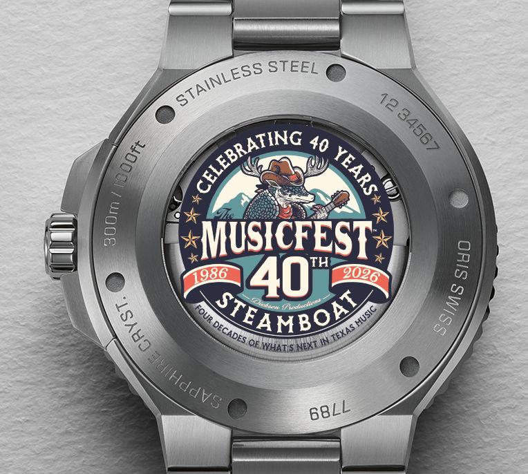Oris Aquis Date Steamboat Springs Colorado 2026 MusicFest 40th Anniversary Edition model 01 733 7787 4154. Stainless steel 41.5 mm case with yellow rubber strap. Black color dial with luminous hands and markers. Swiss made Oris Caliber 733 automatic movement. Domed sapphire crystal with anti-glare coating. Diver rated to 300 meters. Stainless steel uni-directional diver bezel with 60 minute scale.