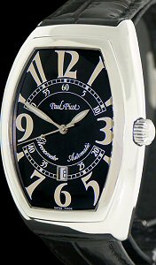 Paul Picot Firshire 3000 Classic automatic self-winding watch with C.O.S.C. chronometer certification. Stainless steel polished tonneau case. Sapphire crystal. Black lacquered dial with large Arabic numerals. Black leather watch strap.