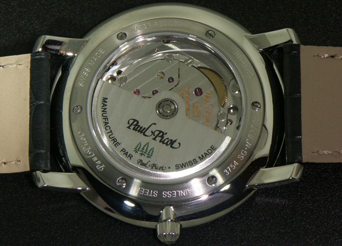 Swiss made Mechanical Automatic (Powered by wrist motion). 25 jewels. Based on Lemania Cal.8810 (this one modified by Paul Picot Cal.099), used exclusively by Breguet today.