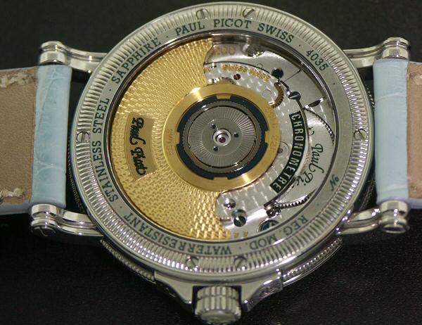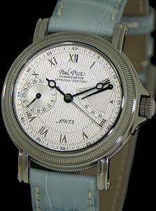 Paul Picot Atelier Power Reserve watch. Automatic self-winding movement Cal. PP1200 with C.O.S.C. chronometer certification and 22-carat solid gold rotor. Silver color textured dial with power reserve indicator and date hand. Stainless steel atelier case with coin edge finish on bezel and case back. Sapphire crystal. Baby blue Louisiana Alligator leather watch strap.