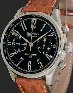Paul Picot Gentleman automatic chronograph watch. Stainless steel case, decorated back, sapphire crystal, black color dial with tachymeter scale, silver tone hands and Arabic numerals. Tan alligator leather band.