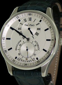 Paul Picot Gentleman automatic self-winding watch with regulator function. Hours hand at 12 o`clock, seconds hand at 6 o`clock, and minutes hand in the center. Stainless steel case, decorated back, sapphire crystal, Silver color dial with blued hands and index markers. Blue alligator leather band.