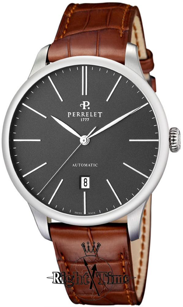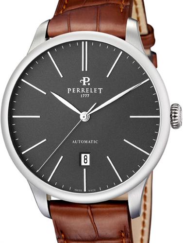Perrelet Classic First Class watch model A1049/3. Perrelet signature round steel case. Automatic self-winding movement. Grey dial. Brown alligator leather strap