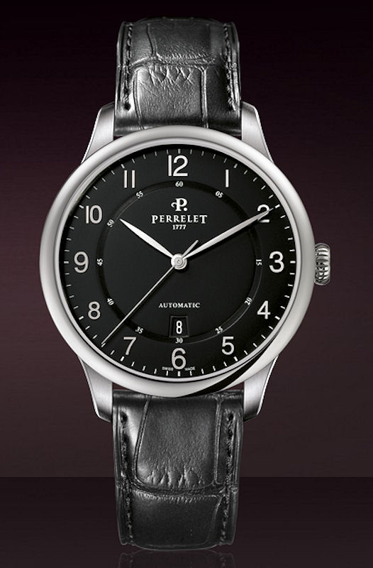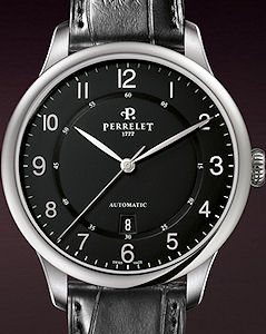 Perrelet Classic First Class watch model A1049/5. Perrelet signature round steel case. Automatic self-winding movement. Black dial with Arabic numbers. Black alligator leather strap